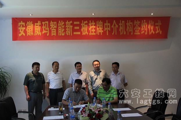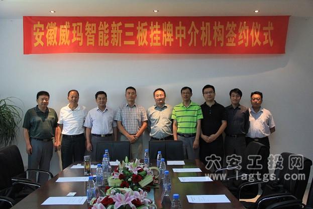9月10日上午,安徽威玛智能科技“新三板”挂牌中介机构签约仪式在威玛会议室隆重举行。市工投公司总经理杨奉海、金安区副区长郑武军、六安信实资产管理公司总经理程治中、大通证券投资银行事业部董事总经理张志凌、中汇会计师事务所合伙人李宁、锦天成律师事务所合伙人黄治国出席了签约仪式。